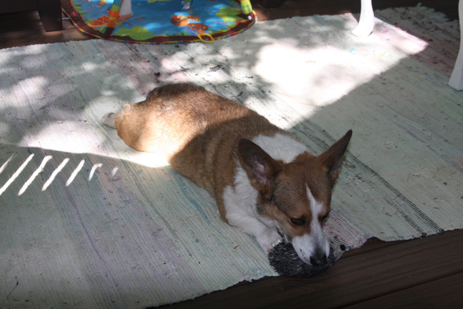 Bode adored the baby, we think. Or maybe he just thought we'd brought him a really active squeak toy. He licked her feet and brought his own toys to her and once or twice I caught him heading out the door with her toys in his mouth. He is the baby after all.